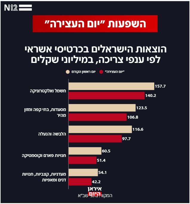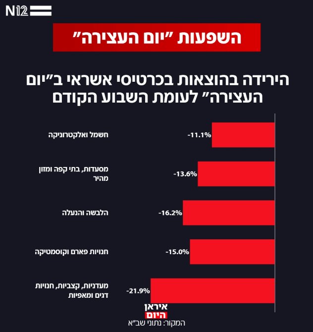 עם זאת, מניתוח ההוצאות לפי ענפי צריכה עולה כי ההוצאות בענפי הצריכה העיקריים ירדו בצורה חדה יותר. לפי הודעת שבא "ענפי המסחר המרכזיים של המשק הושפעו שלשום באופן משמעותי יותר מהפגיעה שנרשמה בסך ההוצאות באשראי בעקבות יום העצירה והשביתה".