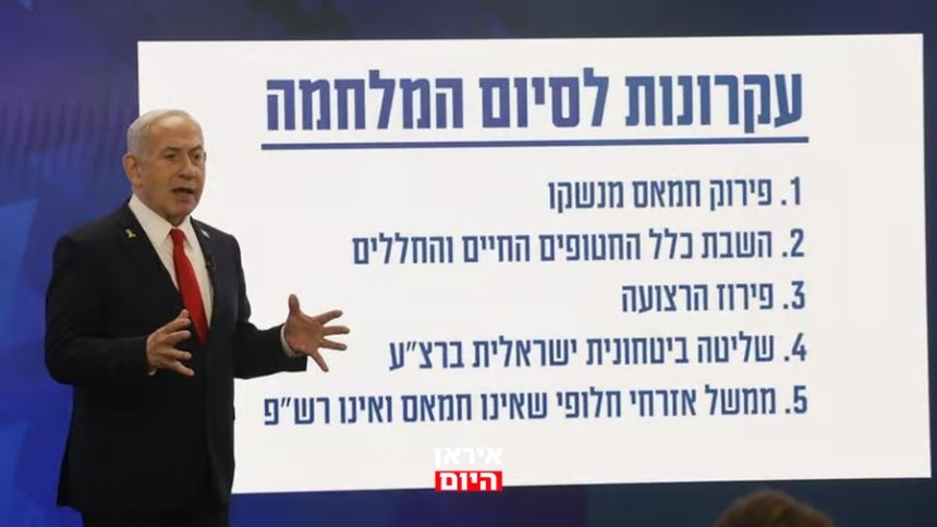 "לפני שבוע כינסתי את הקבינט וקבענו חמישה עקרונות לסיום המלחמה", אמר ראש הממשלה נתניהו למצלמה באולפן הכחלחל באמצע אוגוסט 2025, והרים את ידו והזיז אותה קדימה לכיוון המצלמה פעמיים, כדי להדגיש חמש אצבעות כמו חמשת העקרונות.