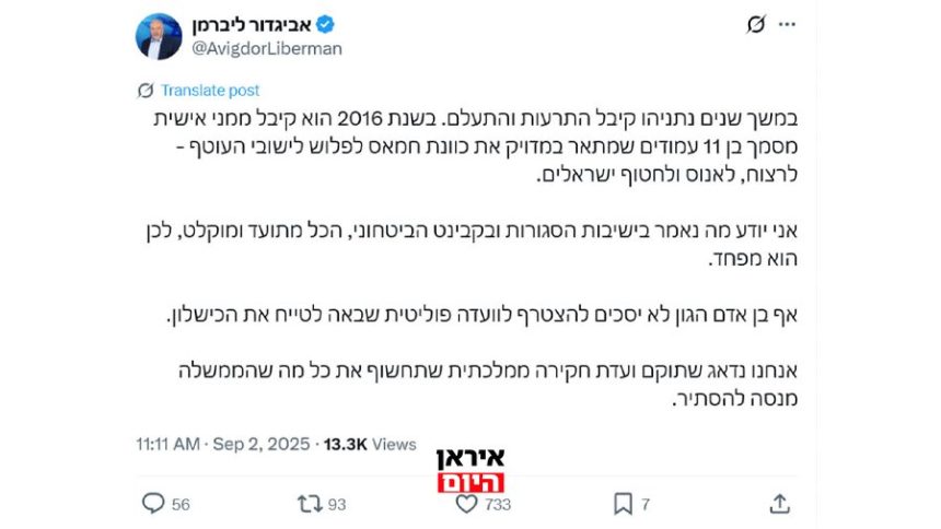 יו"ר ישראל ביתנו, ח"כ אביגדור ליברמן, טען בפוסט שפרסם ביום שלישי ברשת X (טוויטר לשעבר) כי ראש הממשלה בנימין נתניהו התעלם במשך שנים ממספר רב של התרעות שנמסרו לו לגבי כוונות חמאס לקראת אירועי 7 באוקטובר 2023.