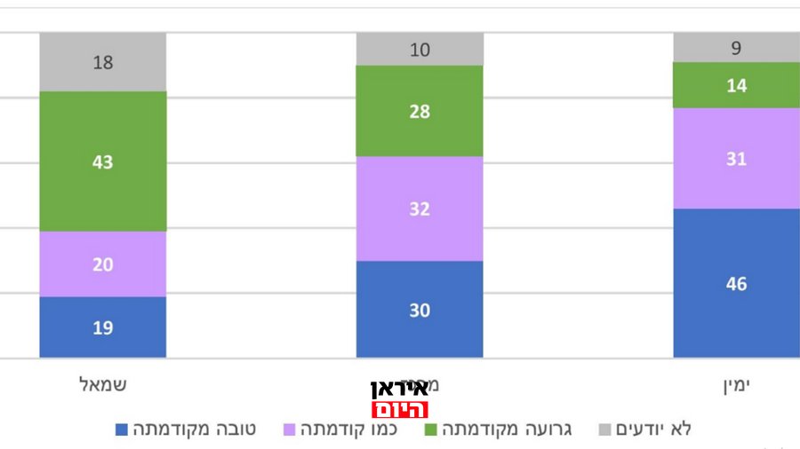 פילוח לפי מחנות פוליטיים (יהודים) מראה כי בשמאל השיעור הגבוה צופים שהשנה החדשה תהיה גרועה מקודמתה. המרכז נחלק פחות או יותר בצורה שווה בין שלוש האפשרויות, ובימין השיעור הגבוה ביותר צופים שהיא תהיה טובה מקודמתה.