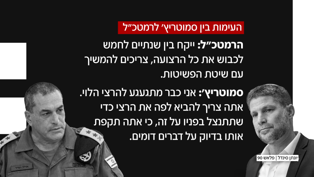במהלך ישיבת הקבינט המצומצם אמש (שני) התפתח עימות חריף בין הרמטכ"ל רב-אלוף אייל זמיר לבין שר האוצר בצלאל סמוטריץ'. העימות פרץ לאחר שזמיר הזהיר כי יידרשו שנים לכיבוש מלא של רצועת עזה, וכי בינתיים יש להמשיך בפשיטות ממוקדות. הדברים עוררו את זעמו של סמוטריץ', שהתפרץ לעבר הרמטכ"ל ואמר: "אנחנו כבר מתגעגעים להרצי הלוי. אתה צריך להתנצל בפניו – אתה תקפת אותו על אותם דברים בדיוק".