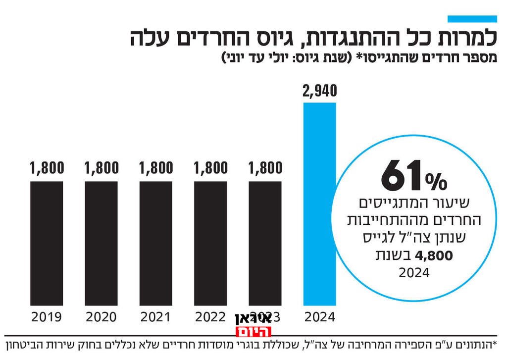 המספר של 2,940 מתגייסים מתייחס לשנת הגיוס 2024 (יולי־2024 עד יוני־2025) ויחסית לצרכים של צה"ל הוא אכזבה גדולה. המספר מהווה רק 61% מההתחייבות שנתן צה"ל לגייס 4,800 חרדים בשנת הגיוס 2024. אבל, בהחלט יש מקום להסתכל גם מנקודת מבט אחרת – בכל אחת מחמש השנים הקודמות מספר המתגייסים עמד על כ־1,800 (קשה להאמין אבל נתוני הגיוס של 2023 טרם פורסמו רשמית, אבל ידוע שזה סדר הגודל אם כי ייתכן שהייתה עלייה קלה).