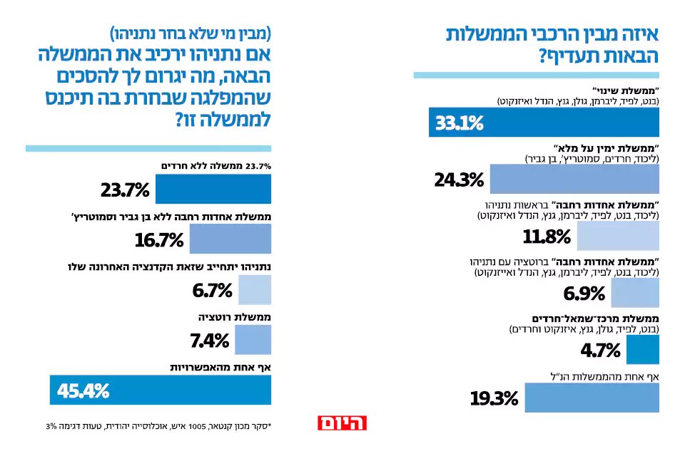 נתחיל בשורה התחתונה: רק 24% מהציבור רוצה שהממשלה שתוקם אחרי הבחירות הבאות תהיה בהרכב הנוכחי, "ימין על מלא". 33% רוצים "ממשלת שינוי" בלי המפלגות הערביות, וכמעט חמישית מהציבור מוכנים לקבל ממשלה בראשות נתניהו או ברוטציה איתו, בתנאי שלא תתבסס על החרדים, הימין הקיצוני או יאיר גולן.